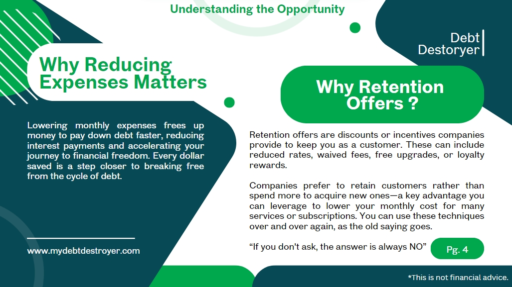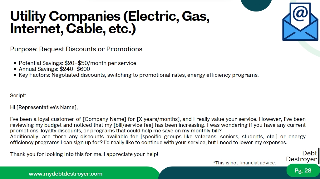This 40-page toolkit provides you with tips, techniques and custom scripts to negotiate with existing service providers, credit card companies and more to receive their retention offers, promotional discounts, interest rate adjustments and more.